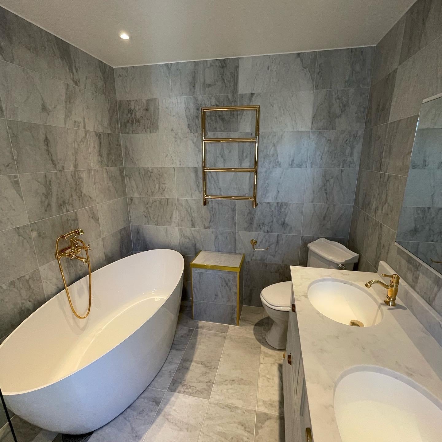 Expert tile installation for entryways, bathrooms, and kitchens, executed with meticulous attention to detail and symmetry.